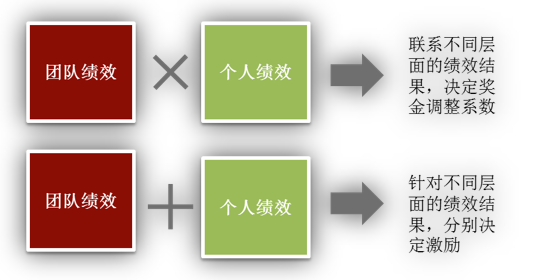 如果对团体和个人的绩效考核结果做"加法",则意味着不同层面的绩效考核结果在奖金计算公式中是各自独立的。在此方法中,奖金将是对团队绩效与个人绩效的分别计算,从而需要管理者合理设定不同层面绩效考核在奖金计算中的权重。某种程度上,这一权衡的过程并不是一门"科学",而更像一门"艺术":由于公司品牌、业务性质、管理模式的区别,各个公司在决定这些权重时都有不同的侧重点。相对于"乘法","加法"更多地保障了员工的利益,不会因为团队绩效较差而一无所获。