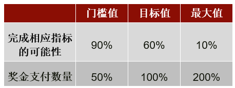 如何在奖金发放曲线上锚定这几个指标水平,将直接影响到"以绩定薪"的差异化程度。"门槛值"指考核对象该指标应达到的最低水平,超过这一水平方可发放奖金;考核对象一般有90%的可能达到该门槛值。由于这一水平不难完成,公司一般只会酌量发放部分奖金,例如原定目标奖金的50%。"目标值"的设定则应更具挑战性,使考核对象一般有约60%的机会完成。"最大值"则反映了极其出色的绩效表现,考核对象一般仅有10%的完成可能;员工若达到这一绩效水平,则能够获得超额奖励(例如相等于2倍的目标奖金)作为激励。