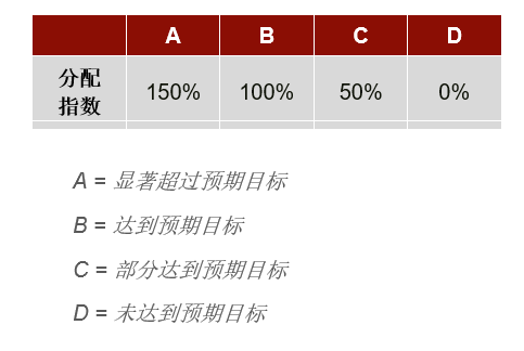 如今,部分公司在分配奖金时仍然采取按工资比例"一刀切"的做法,奖金没有按绩效做到差异化分配,这与"以绩定薪"的理念相违背。为了使奖金的差异化得到充分体现,各部门主管需要跟踪观察员工全年的绩效表现,包括其指标的完成度、胜任力水平、为部门或团队做出的贡献,等。如下表所示,员工的绩效表现可以被划分为4至5个等级,而奖金的支付则取决于其对应的奖金分配指数。总奖金池的分配方式,是将所有的个人奖金分配指数加总后,按个人奖金分配指数所占的权重按比例分配。