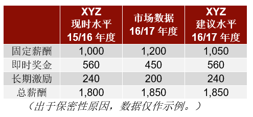 下表展示了该DCEO目前的薪酬水平、市场上对应岗位的现时薪酬水平,及建议的下年薪酬水平;市场数据是根据最新的市场薪酬奖金增幅预测估计得出的。