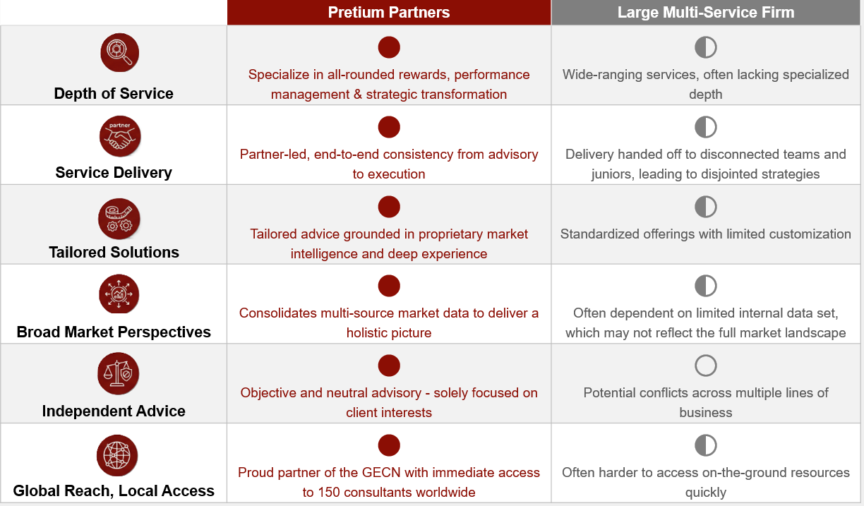 Pretium Partners offers partner-led, bespoke advisory grounded in independent research to ensure strategic consistency from planning to execution with a conflict-free, holistic market perspective. By leveraging global alliances with the GECN and our deep expertise, we deliver tailored HR strategies precisely aligned with our clients' unique corporate objectives.