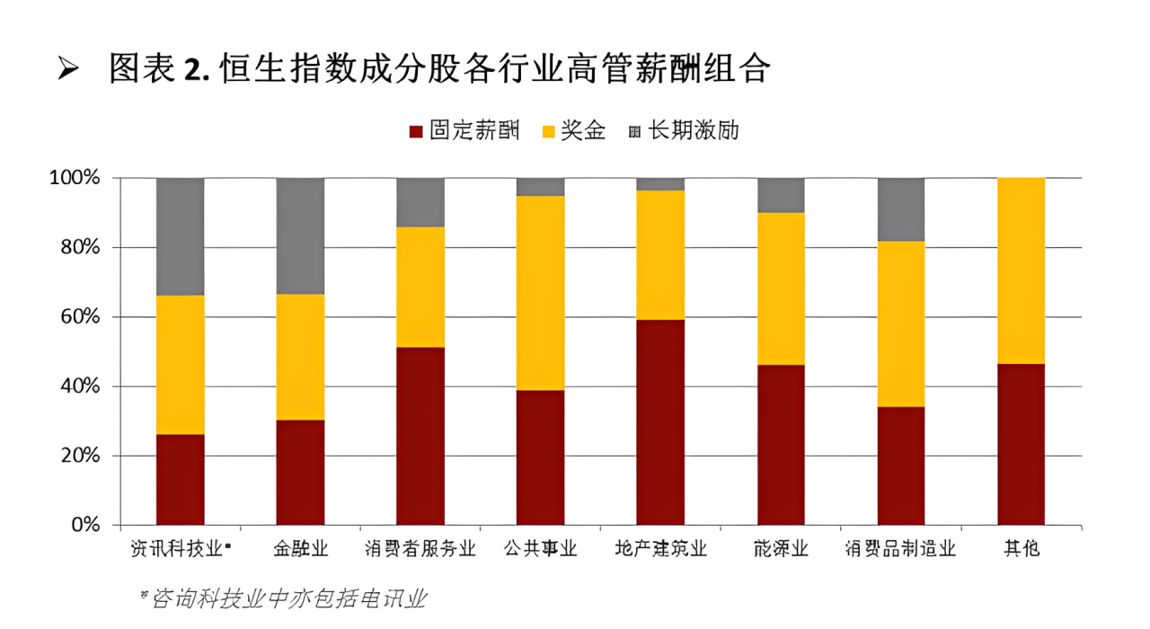 如图表2所示,每个行业的薪酬组合比例有所差异。金融业及资讯科技业的薪酬组合较为平衡,为高管提供长期激励的做法十分普遍。其他行业高管薪酬以固定薪酬及奖金为主,长期激励比例低于总薪酬的20%。