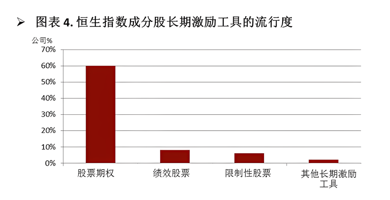 长期激励计划有很多不同工具,且各自有其利弊。股票期权计划可以把高层管理人员与股东之间的利益挂钩,激励高管更关注企业长期发展。尽管股票期权计划最后的价值仍受到股票价格的影响,它的归属一般与时间而非企业长远的业务表现挂钩,因而减弱了它对强化高管与股东利益关联的作用。根据博盛的调研,股票期权计划是在香港上市的中资及港资企业中最常见的长期激励工具,60%的企业皆采取此计划。但是,由于受如股权稀释,会计成本等因素的影响,在采用股票期权计划的30间公司中,只有11间于授予股票期权给高层管理人员,13间公司从来没有真正实行股票期权计划,或已经有超过5年没有授出股票期权。
