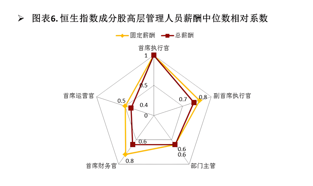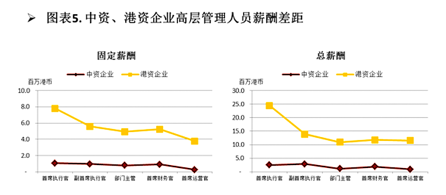 由于超过半数的恒指成分股公司为中国国企或港资家族企业,博盛的调研发现恒指成分股公司与其他国际企业相比(图表5),以绩定薪的文化相对落后。通过仔细的比较发现,中资企业尤其是国企的高管薪酬水平大幅低于与之规模、行业类似的港资企业。是次研究还发现,中港两地企业首席执行官的薪酬差距大于其他高层管理人员。