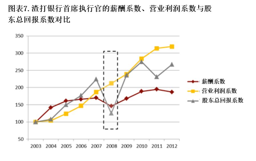 以上图表显示股东总回报系数在2008年金融危机时严重下降,但经营利润仍保持正面增长。由于两者都是决定首席执行官年终奖金及绩效股票的关键绩效指标之一,首席执行官的总薪酬在2008年亦小幅下降以反映股东总回报的下跌。